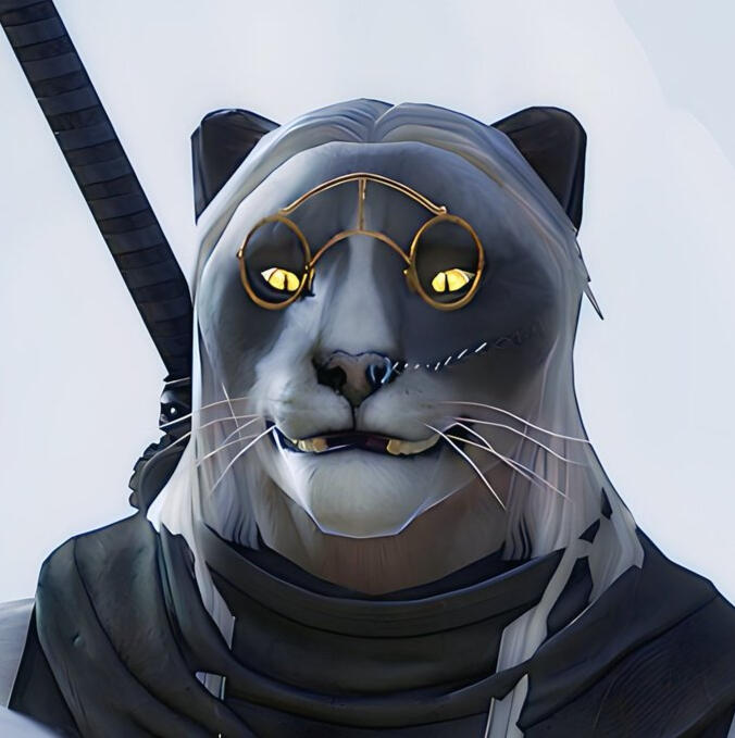 Blad the kat is a 23 year old khajiit, grey fur with long white hair, and yellow bright eyes. He wears glasses made of dwarven metal, and he often wears his nobal outfit with his favorite black scarf. He use to live in clockwork, but is now living in markarth. He has 4 nicknames "Khajiit Fabricant" "Bthlftahnd" "Dwemer kitty nerd" and "Wholesome Sussy Pants" -_-His biggest accomplisment was saving clockwork city from someone that tried to recreate the numidium to take over nirn, but they fail, and blad almost died so sotha sil rewarded blad with fabricant body parts that blad lost in battle.